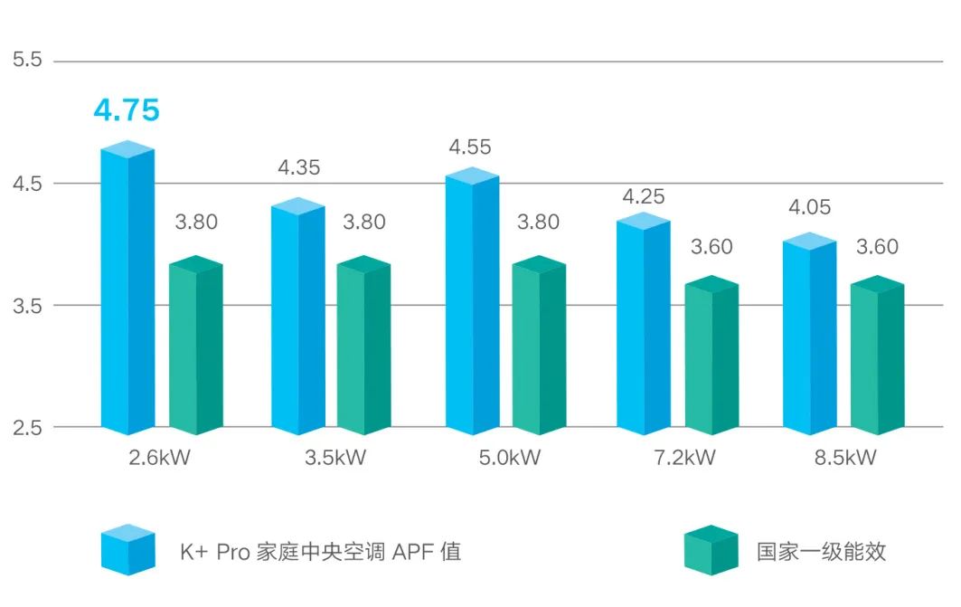 采用全直流变频技术,K+pro系列产品APF较国标一级能效要求平均高17.9%。日常待机情况下,由内机来维持待机状态,外机则断电,实现待机低功耗,机组更节能。