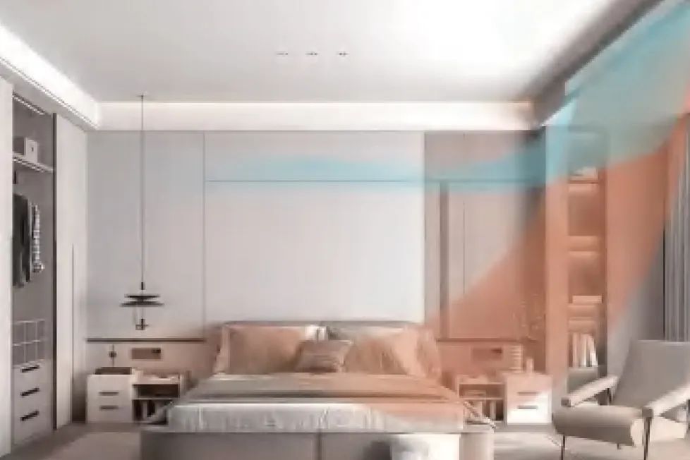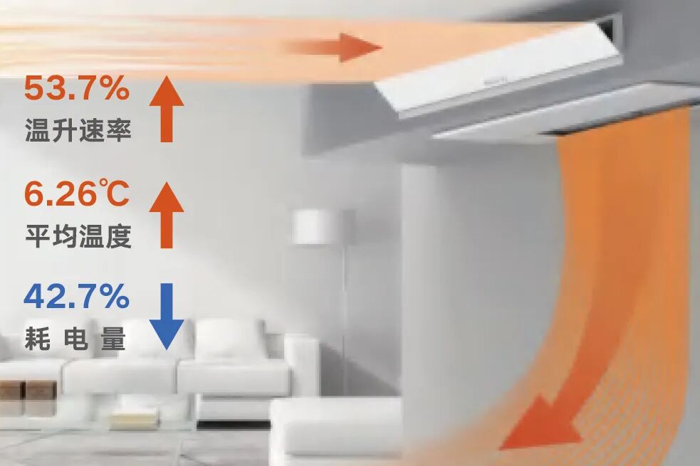 在制热模式下,下风口垂直地面送风,暖空气直达地面后自然升腾温暖整个空间,1.6m以下区域相比传统风管机升温速率提升53.7%,平均温度上升6.3℃,相比普通风管机可节能42%以上。