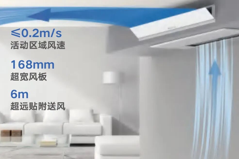 在制冷模式下,采用自适应智慧送风科技,风速、送风角度智慧控制,实现不同风速的气流6m远距离贴附屋顶送风 ,冷空气沐浴式下沉 ,避免冷风直吹的困扰,沁凉舒适。