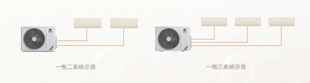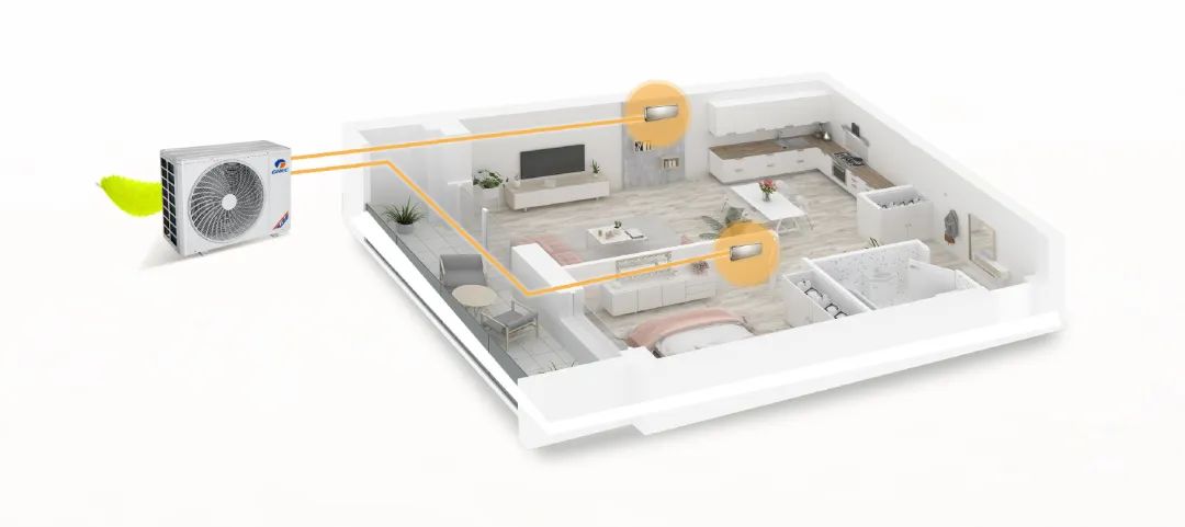Free系列一台室外机可连接多台室内机,同时给多个房间提供冷量或热量,避免了传统分体式空调多个外机占用空间大,不美观的情况。
