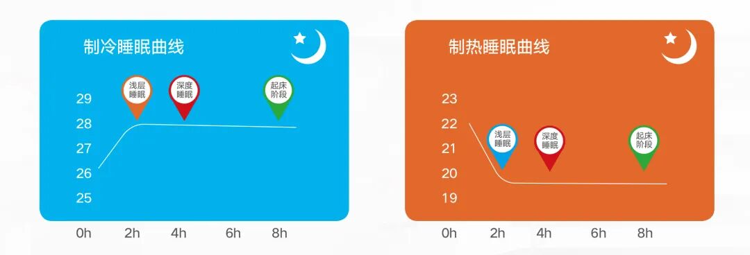 选择睡眠模式,机组依据人体睡眠体温变化,按照科学的“温度—时间”数据库智能运行,且制热时全程保护,不让一丝冷风吹出,全面呵护用户睡眠。