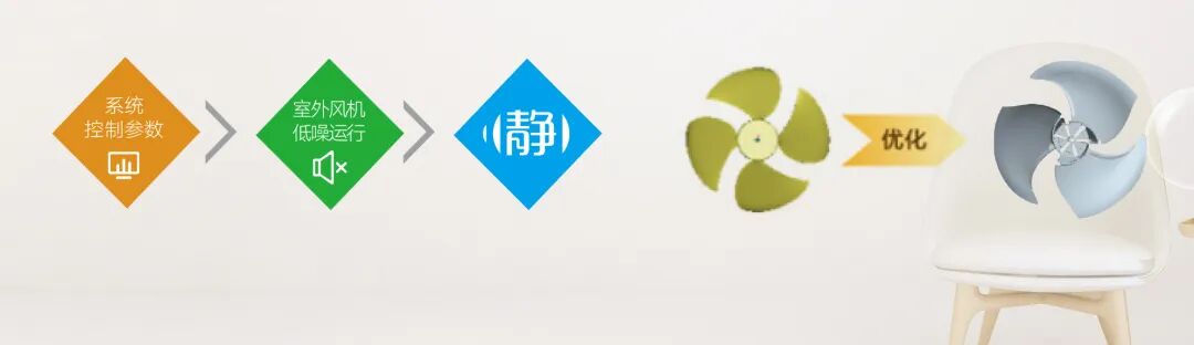 Free系列将电子膨胀阀外移到室外侧,室内机无节流元器件,从根本上隔离了室内外的噪音,室内机噪音低至24dB(A);室外机采用全新设计的三维螺旋风叶,风量更大,噪音更低。同时机组根据系统参数自行调整风机控制,保证机组低噪运行。