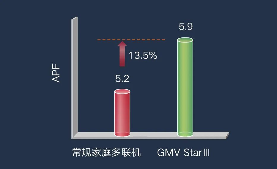 GMV StarⅢAPF最高达到5.9,超新国标一级能效13.5%,比上一代能效提升10%,高效节能,帮您节省更多电费。