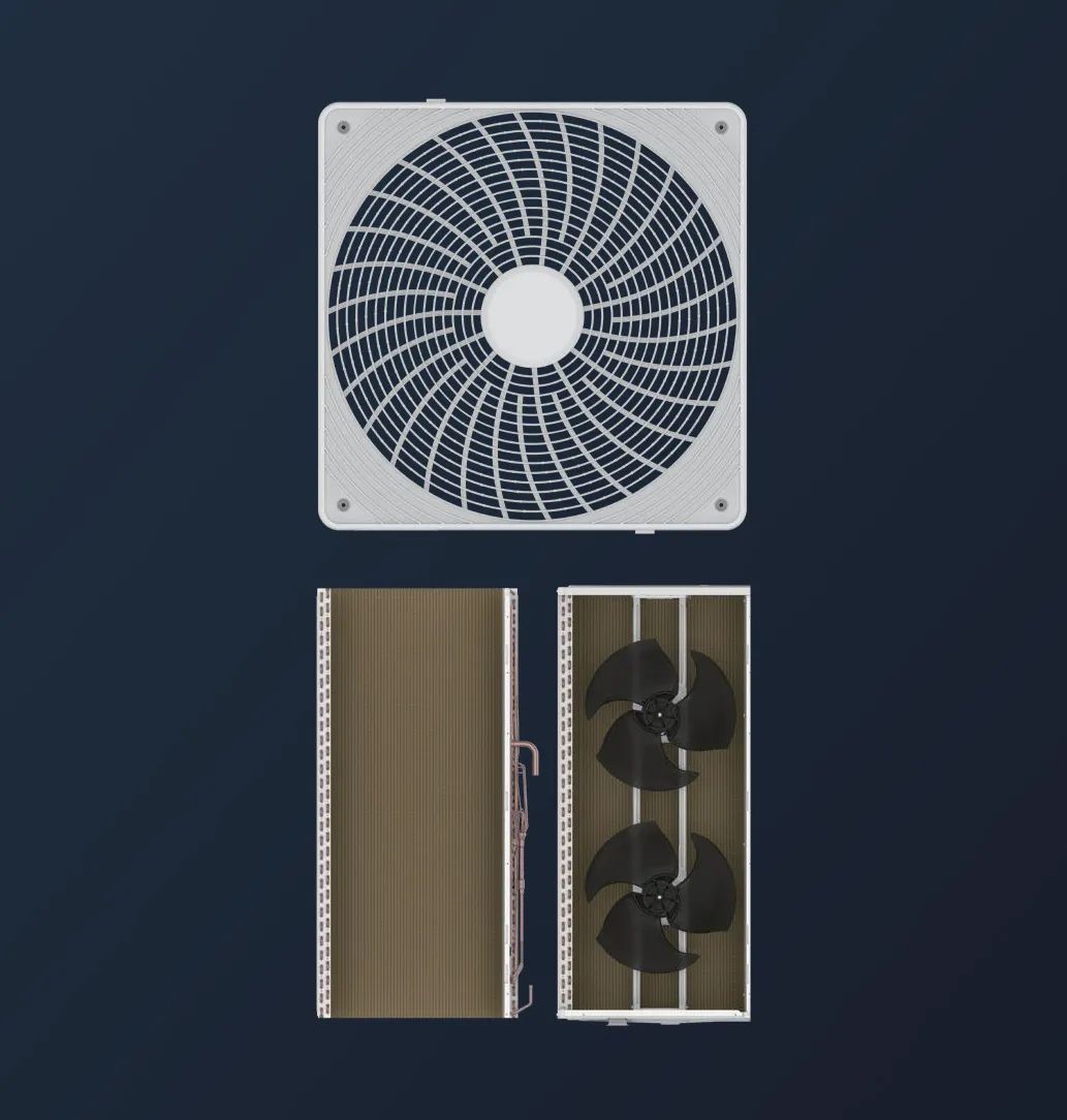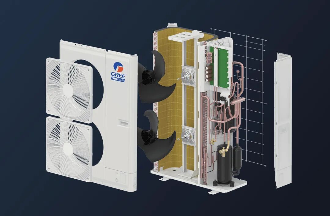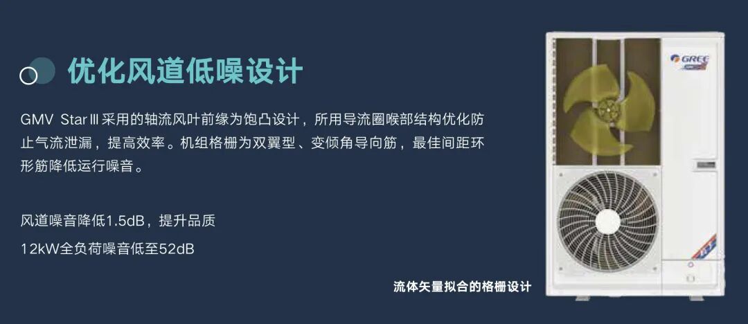 GMV StarⅢ采用环抱式换热器,结合双翼V型桁架、鞍仿形导流圈及大流量低噪格栅,风量对比普通多联机提升10.5%;同时机组换热器采用低阻高效流路,实现流路与风场高效协同换热,效率进一步提升。