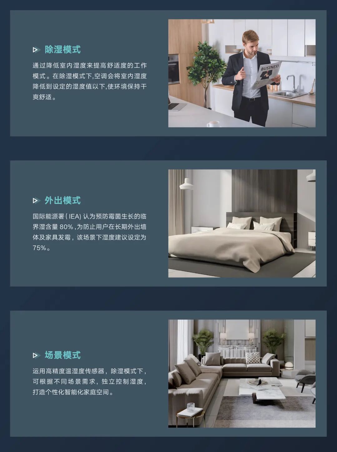 搭配室内机可实现多种模式设定,针对用户需要,可自由设置环境湿度要求,实现自动除湿运行。