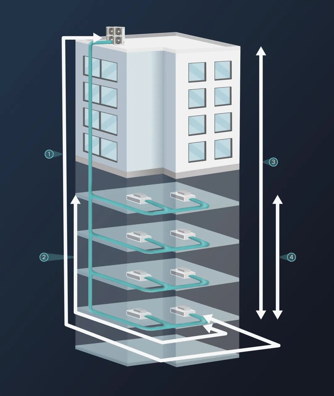 GMV StarⅢ结合高落差压力控制技术、内机落差识别技术、中间压力调节技术、管长自修正技术、深度过冷技术,提高配管长度,提升施工灵活度。