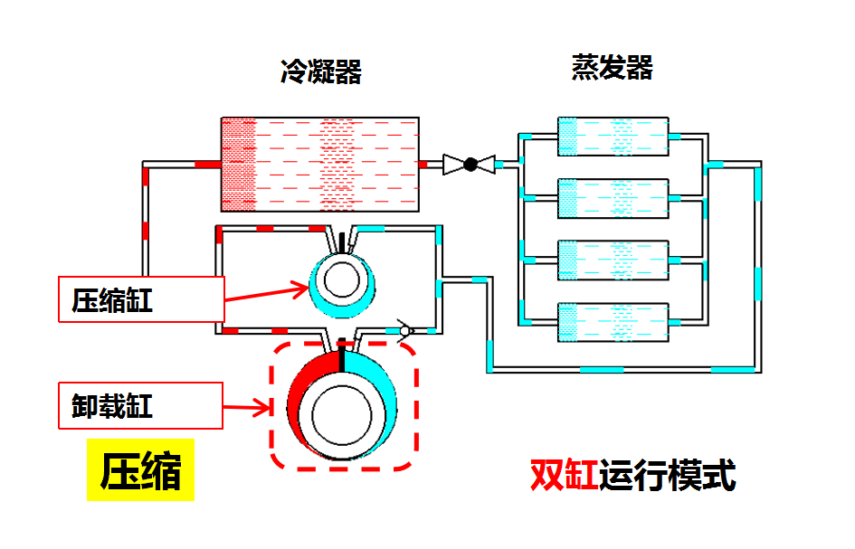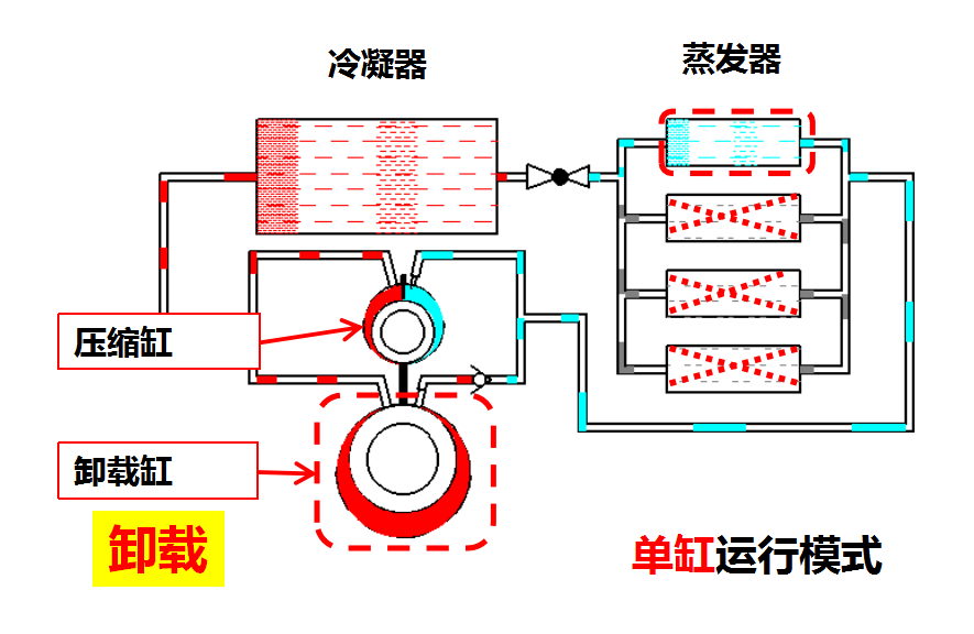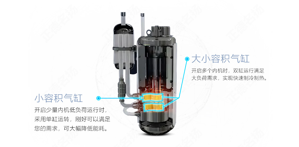 ▶ 开启少量内机时,采用单缸运转,可以大幅降低能耗。