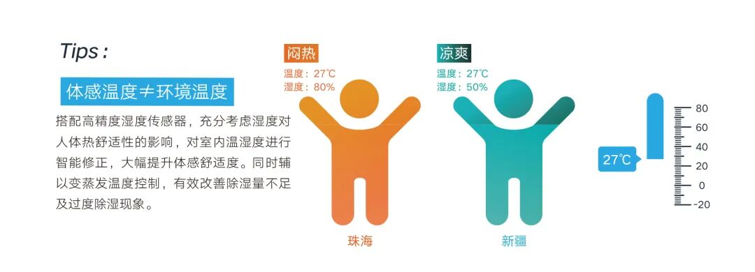 搭配高精度湿度传感器,充分考虑湿度对人体舒适性的影响,对室内温湿度进行智能修正,提升体感舒适度。