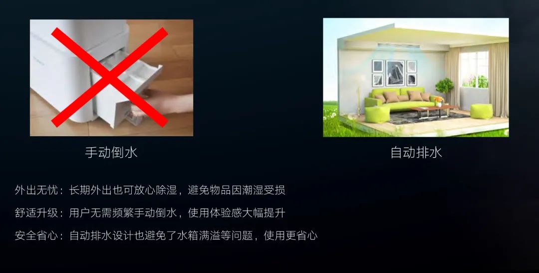 传统除湿机水满后需要手动倒水,否则无法继续工作。格力睿风可自动排水,除湿省心的同时可以实现24小时不间断除湿。