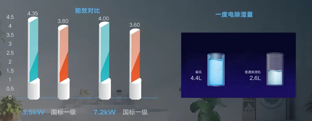 格力睿风系列风管机采用全直流变频技术,冷热均节能,APF 较国标一级能效要求平均高12.8%。变频除湿模式下平均一度电可取水4.4L,相比普通除湿机一度电取水2.6L,更为高效节能。