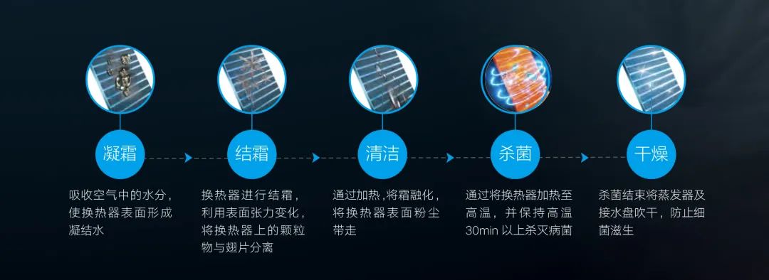 高温净菌自洁系统,创新五重步骤深层洁净,强力清洁蒸发器上的粉尘污垢等,自动进入高温灭菌阶段,高效净菌,让空调更洁净、出风更健康。