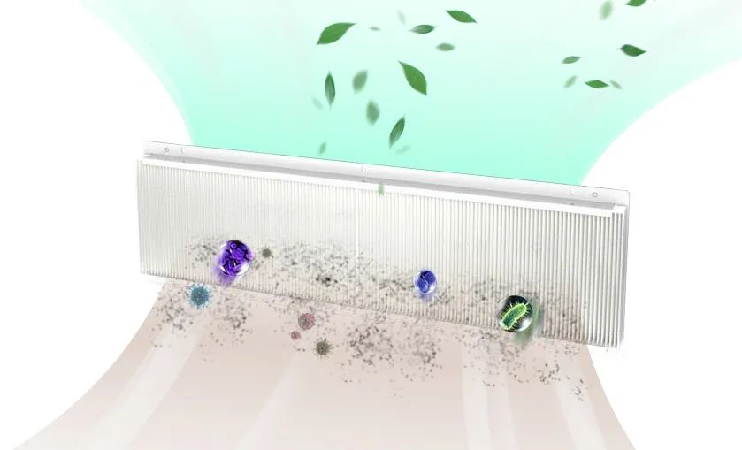 离子杀菌模块:出风口处配备离子杀菌模块,可持续循环净化室内空气,2 小时除菌率高达93%以上。
